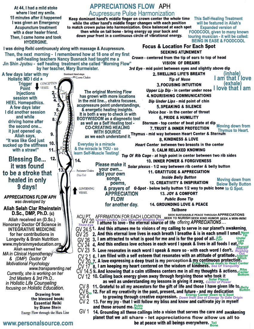 The first morning after it happened, I remembered a Morning FLow exercise that was taught to me by a student of Mary Burmeister at just 18... Nancy Busnack was part of a healers intentional Communiity that I became part of - because I just wanted to be around these advanced healers who were mostly twice my age. I had turned vegetarian at 13 because I didn't want to eat my friends... and these people were doing mostly raw foods and I became part of the communtiy as it's youngest member. Peter Busnack had helped me through my first fast because my ankle blew up and he was not allarmed and just told me to drink Hore Hound Tea for as long as I could stand it... so the swelling could go down. I drank only hore hound tea for 5 days... and my ankles were fine... I knew I needed to learn more from them. Nancy Busnack was an angel to me ... she took me under her wing and taught me Bach Flowers Remedies and I got the whole kit and started to used them... and she taught me Morning Flow and when I lost my smile I felt it would help me... so I started doing it every morning and it grew and grew... I added points, song prayers & affirmations for each point - then I began using the technique for first aid and found that I could both diagnosis as well as Harmonize these point to create profound Self-Healing fairly quickly.